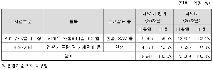 리빙 분야에서 리하우스 및 홈퍼니싱 사업을 영위하고 있습니다.