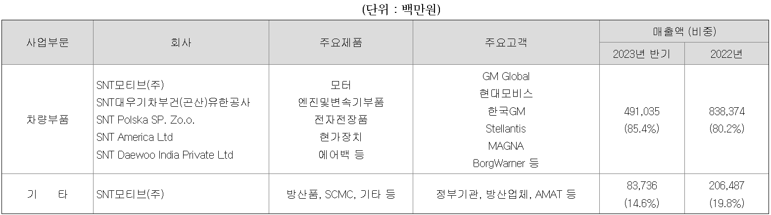 SNT모티브의 사업부문은 차량부품사업과 기타사업으로 구분됩니다.