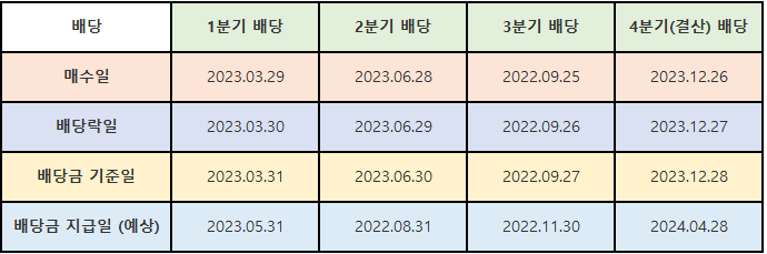 ※ 배당금 지급일 : 배당 지급 예상일을 기준으로 지급하지만 며칠 차이가 있을 수 있음