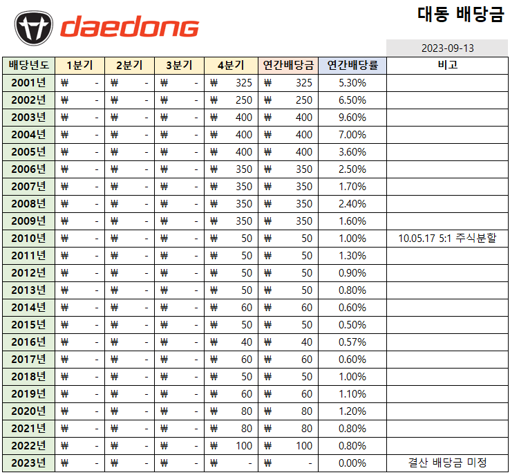 | 동원금속 배당금, 배당률, 주주환원정책 (2000년~현재까지) (0) | 2023.09.12 |