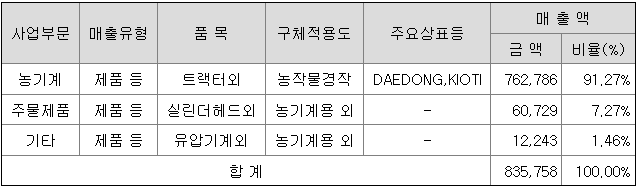 농기계부문은 농업용 기계인 트랙터, 콤바인, 이앙기 등을 공급하고 있으며,