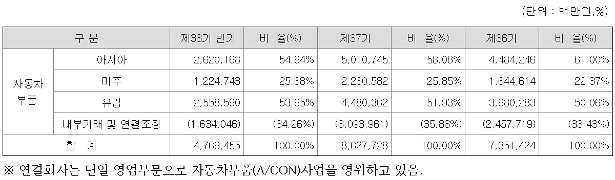 한온시스템은 OEM(주문자생산방식) 납품을 주로 하는 자동차 열 관리 시스템 단일품목 제조회사로서 한국내에는 대전공장, 평택공장, 울산공장, 아산공장, 경주공장을 보유하고 있으며 본사 및 해외법인 모두 자동차의 열 관리 시스템을 생산하는 단일 사업부문을 영위하고 있습니다.