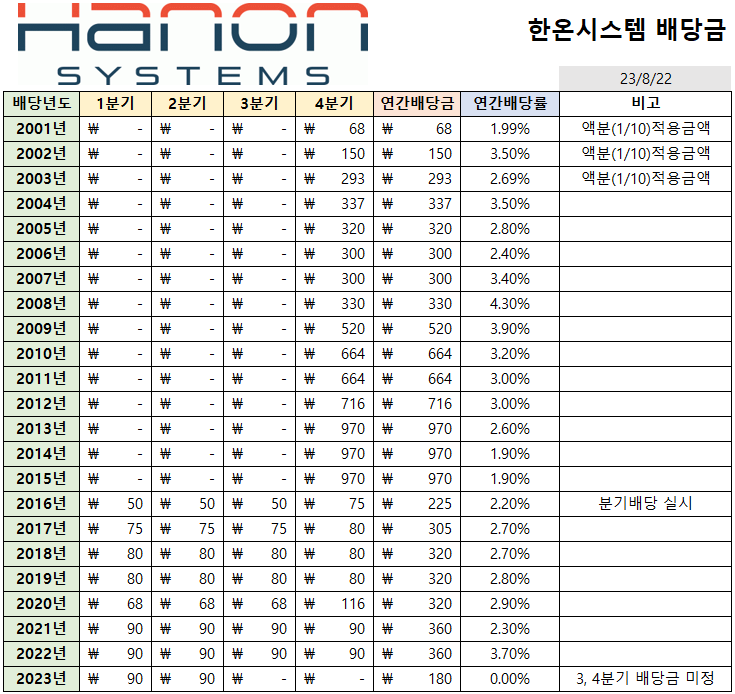 한온시스템은 분기배당을 실시하며,