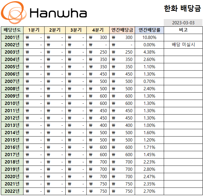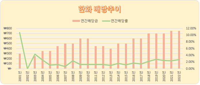 한화는 주주환원정책의 일환으로 매년 일정수준의 배당을 실시하고 있으며,