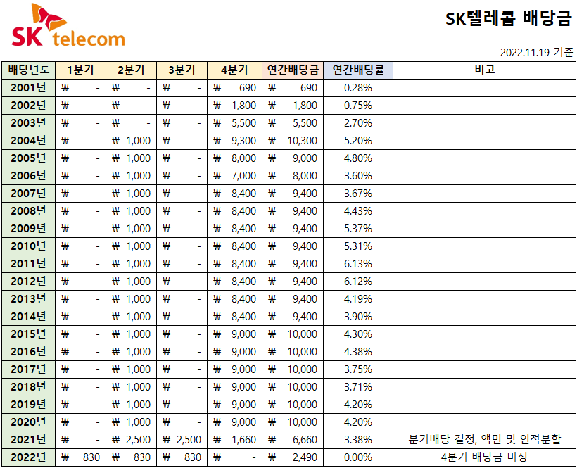 SK텔레콤은 분기배당을 실시하며,