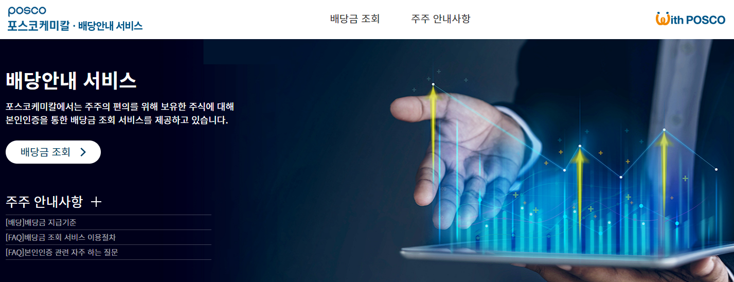 배당안내 서비스 포스코케미칼에서는 주주의 편의를 위해 보유한 주식에 대해 본인인증을 통한 배당금 조회 서비스를 제공하고 있습니다. 배당금 조회