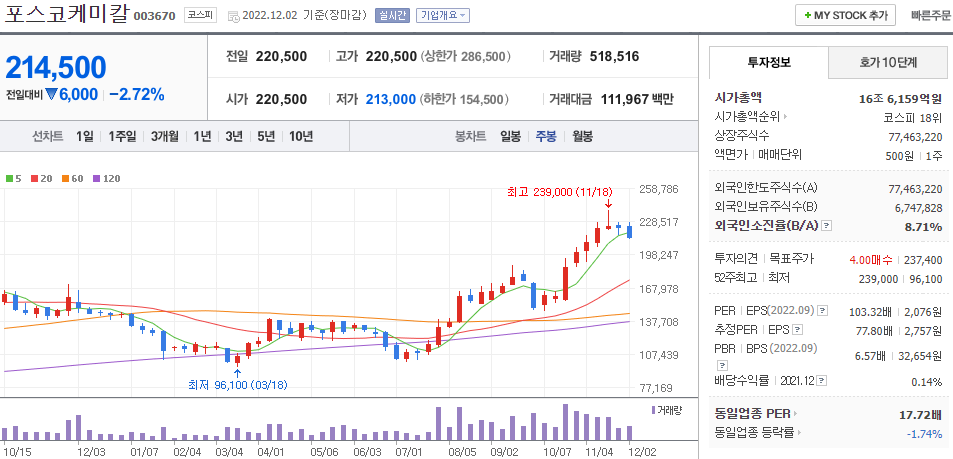 포스코케미칼 [이차전지 양극재와 음극재 관련주, 내화물 관련주, 석회 관련주]