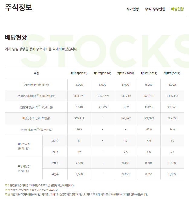 2021년도 배당금은 0원 (1주당 0.011주 현물배당 = 약 2,508원)